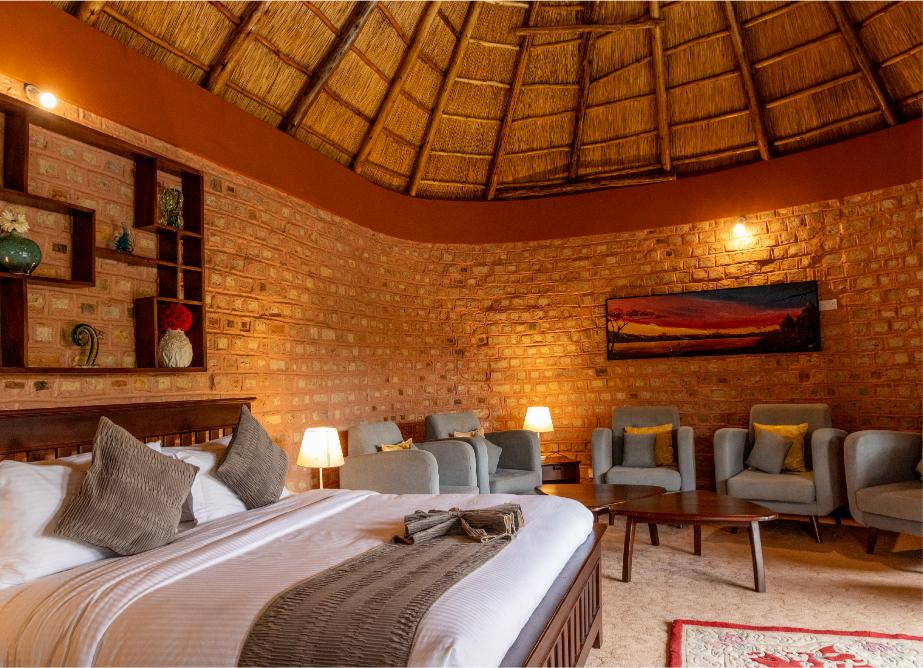 Sprawled over an inviting 225 sq. ft., the Double Cottage is a spacious retreat ideal for couples or small families. Fashioned with authentic brick walls and traditional thatched roofs, the space looks resplendent in warm, earthy tones. Enjoy generous room to relax, complete with modern comforts like high-speed Wi-Fi, a fully stocked mini-bar, and plush bathrobes, making it a premier choice for a relaxing boutique resort stay.